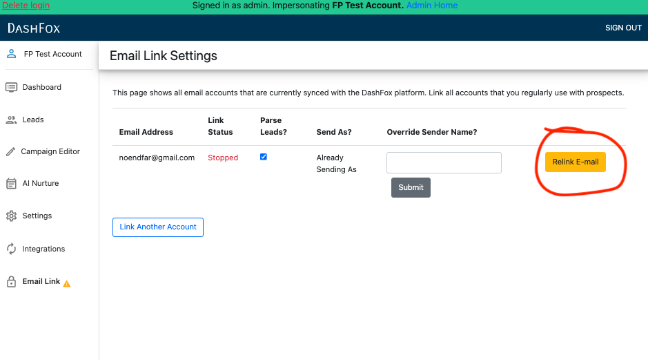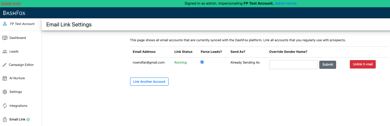 Once your email is successfully linked, you should be returned to the Email Link tab and see your email listed. If the status is not immediately listed as "running", please wait 10 seconds to allow the email to sync before refreshing your browser.
