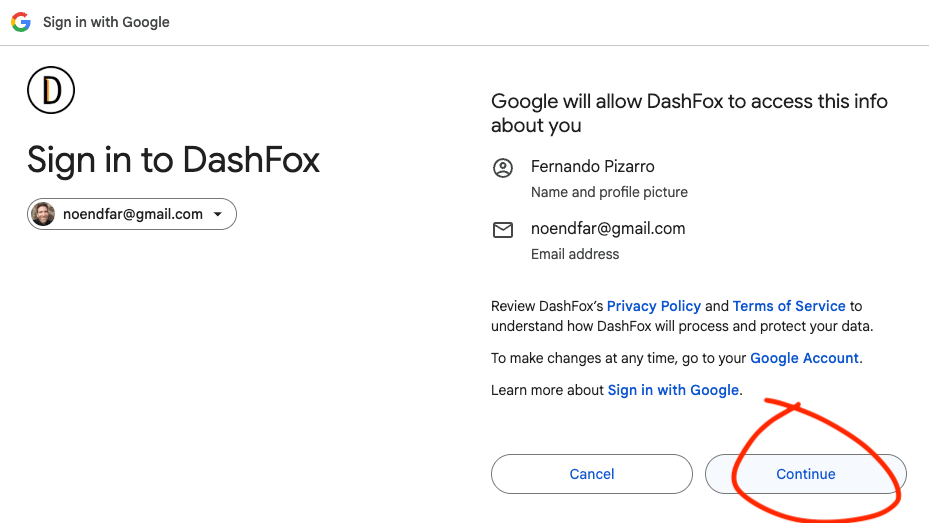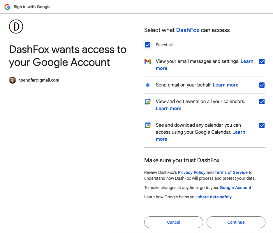 The next screen will ask you to grant permissions to DashFox, so that we can send/receive email on your behalf. All the permissions must be granted for DashFox to function properly. If you have questions about the scope of these permissions and why they are necessary, please reach out to hello@dashfox.com for details.